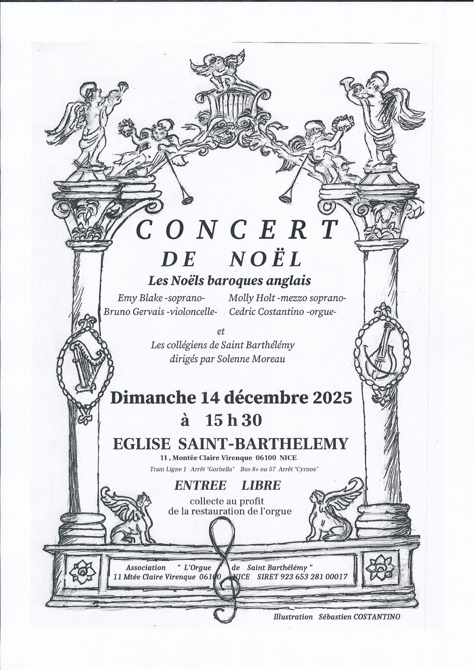 Nous avons le plaisir de vous convier à assister à notre Concert de Noël qui aura lieu le dimanche 14 décembre 2025 à 15h30 en l’Eglise Saint Barthélémy, et qui sera donné au profit de la restauration du Grand Orgue.
