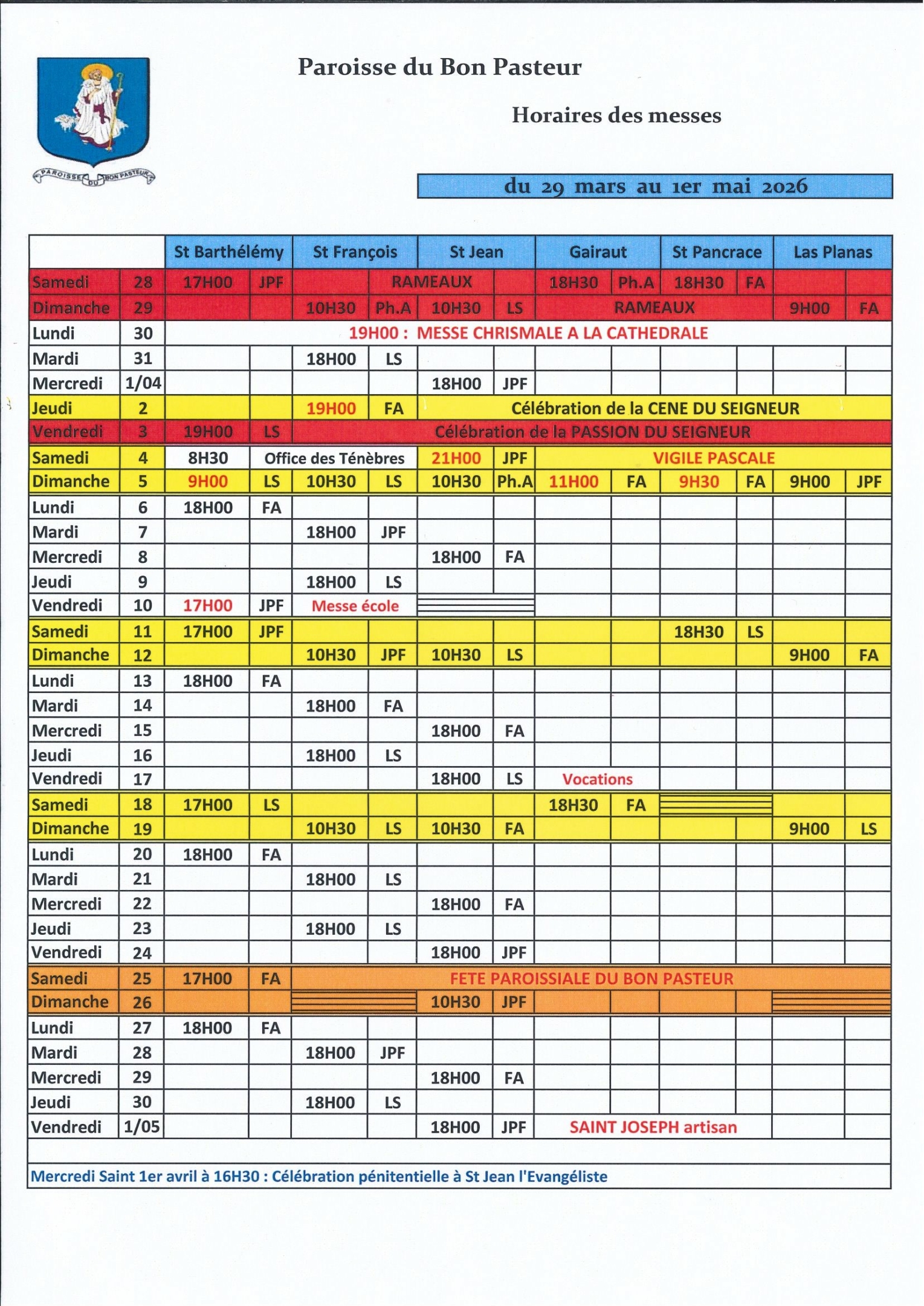 Horaires des Messes pour le mois d’avril 2026