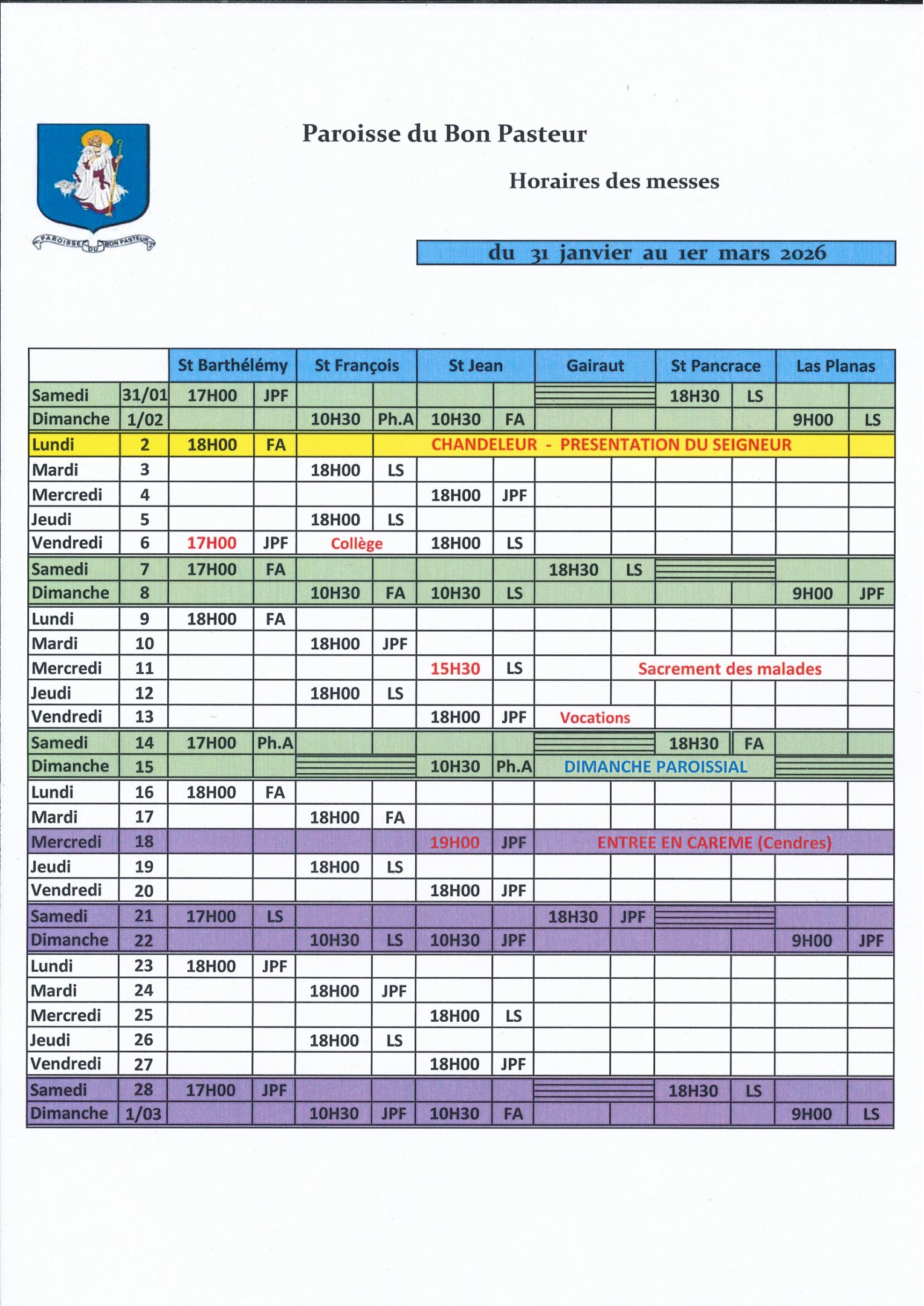 Les Horaires des Messes pour le mois de février 2026