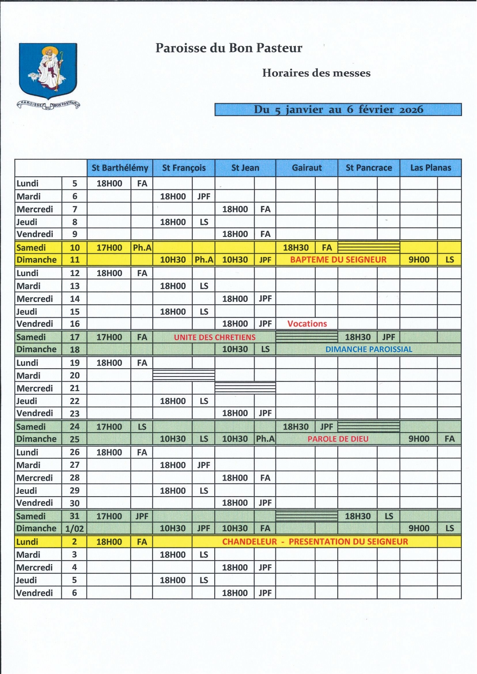 Les Horaires des Messes pour le mois de janvier 2026