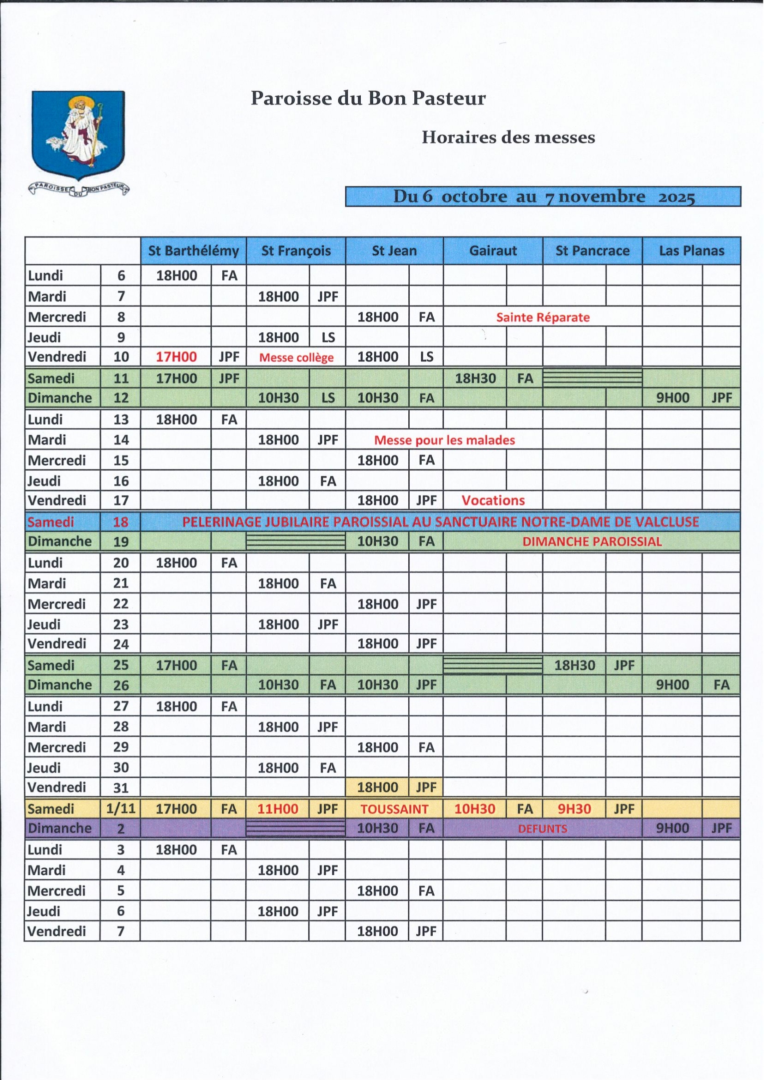 Les Horaires des Messes pour le mois d’octobre 2025
