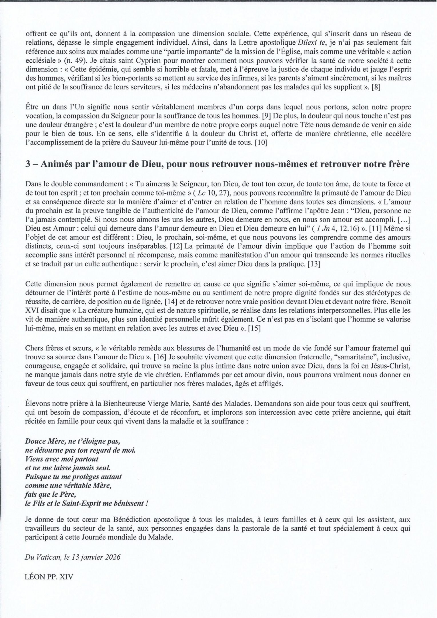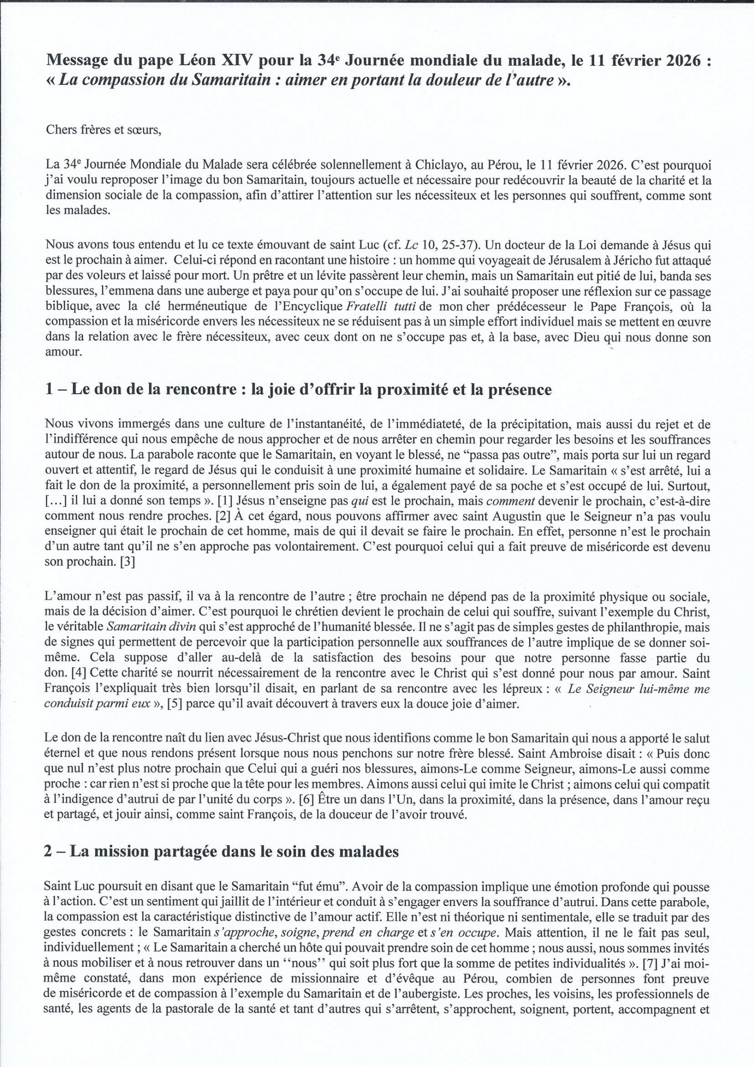 Message du Pape Léon XIV pour la 34ème Journée mondiale du Malade, le 11 février 2026