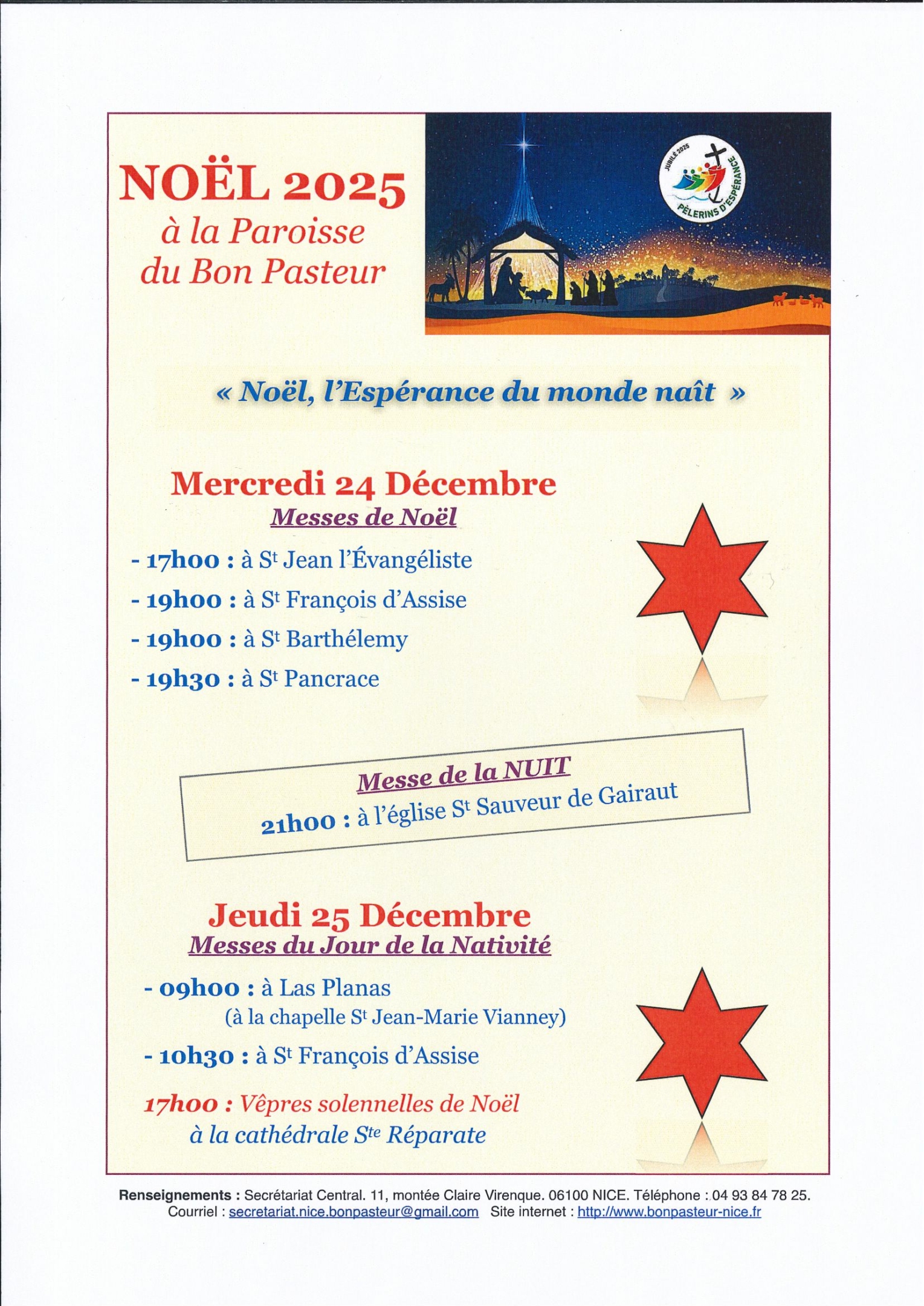 Programme des Festivités de Noël et de la Nativité de Notre Seigneur Jésus Christ, en notre Paroisse du Bon Pasteur, placé sous le signe de l’Espérance, sous le thème : « Noël, l’Espérance du monde qui naît »